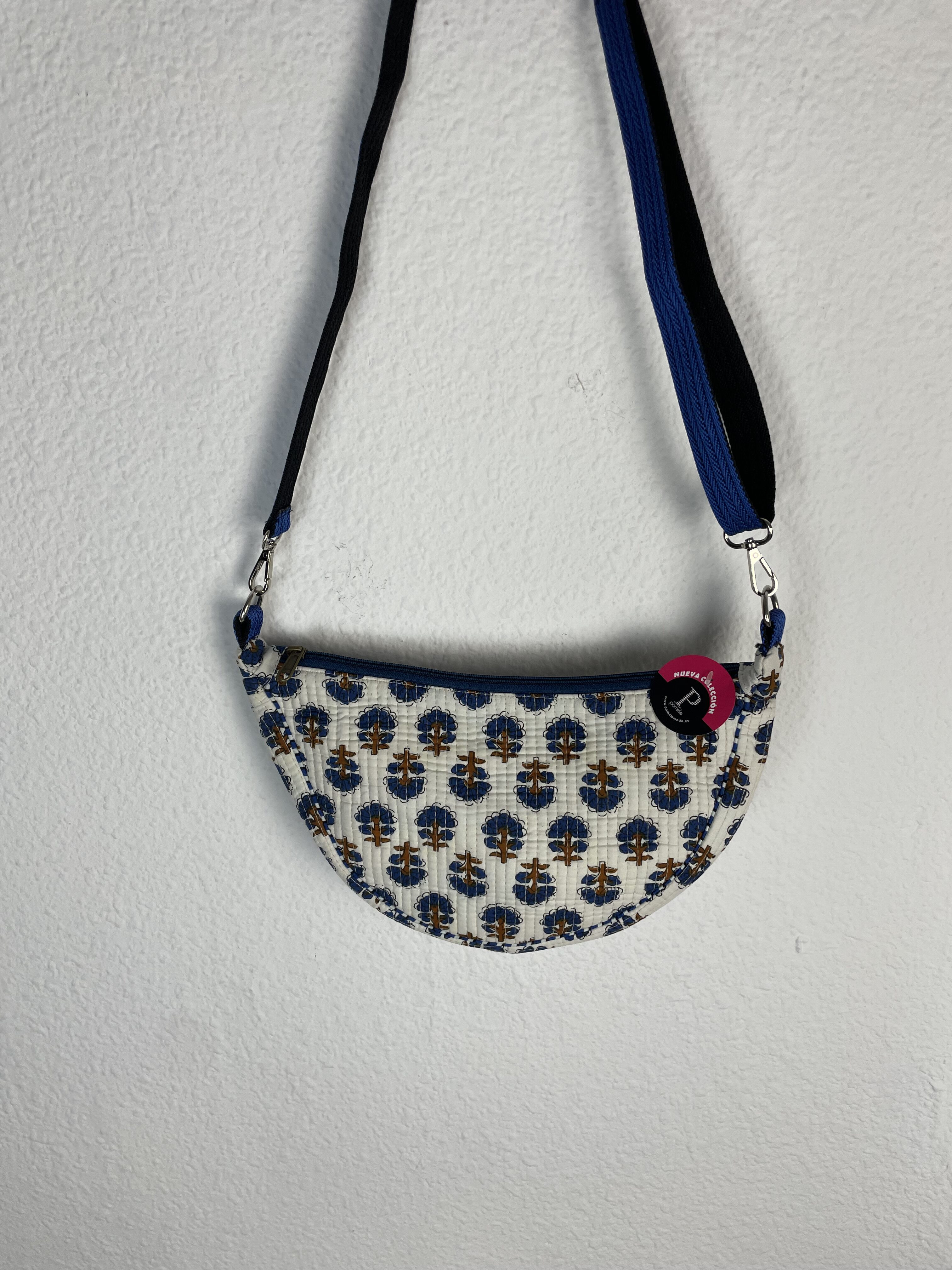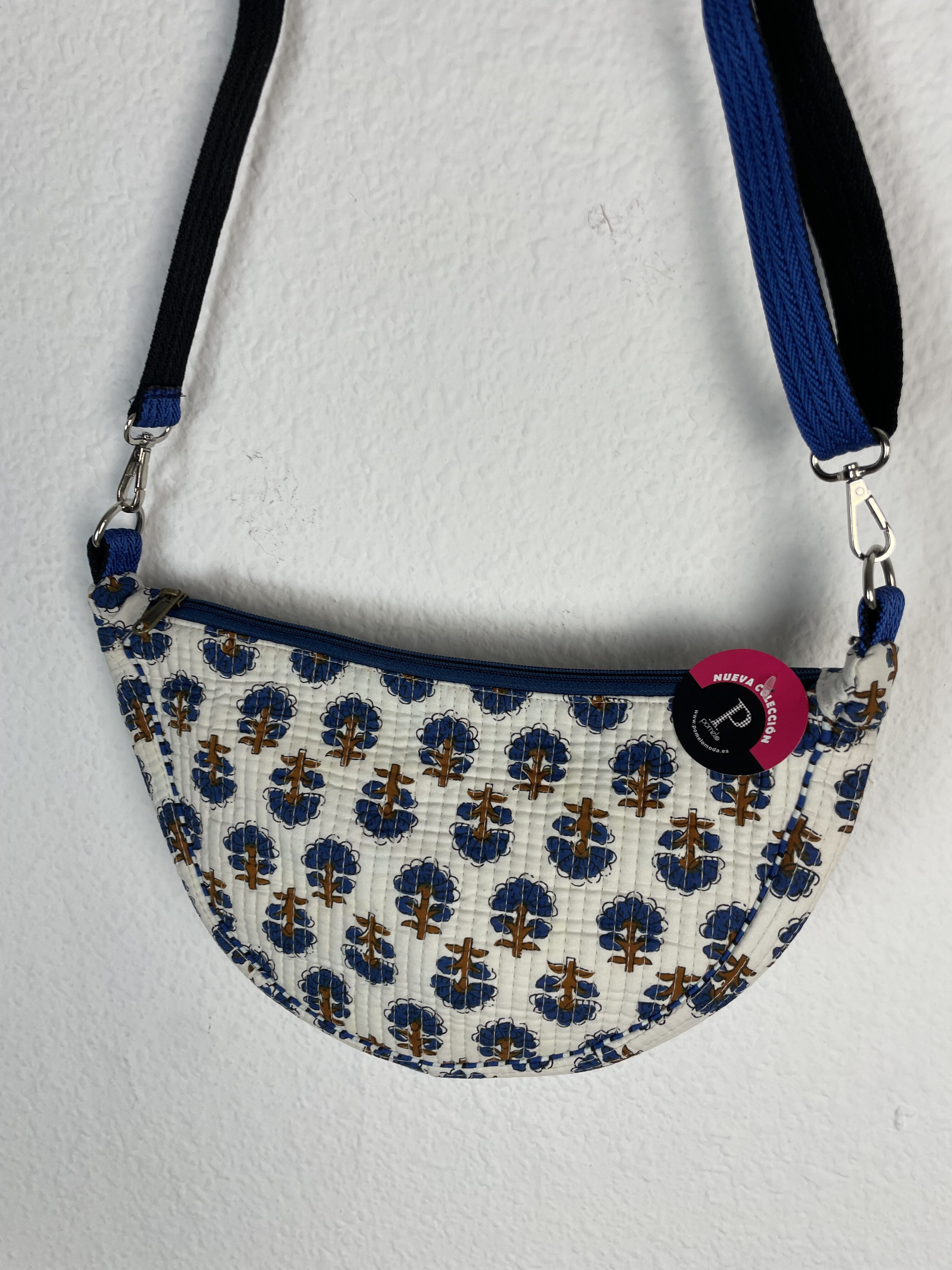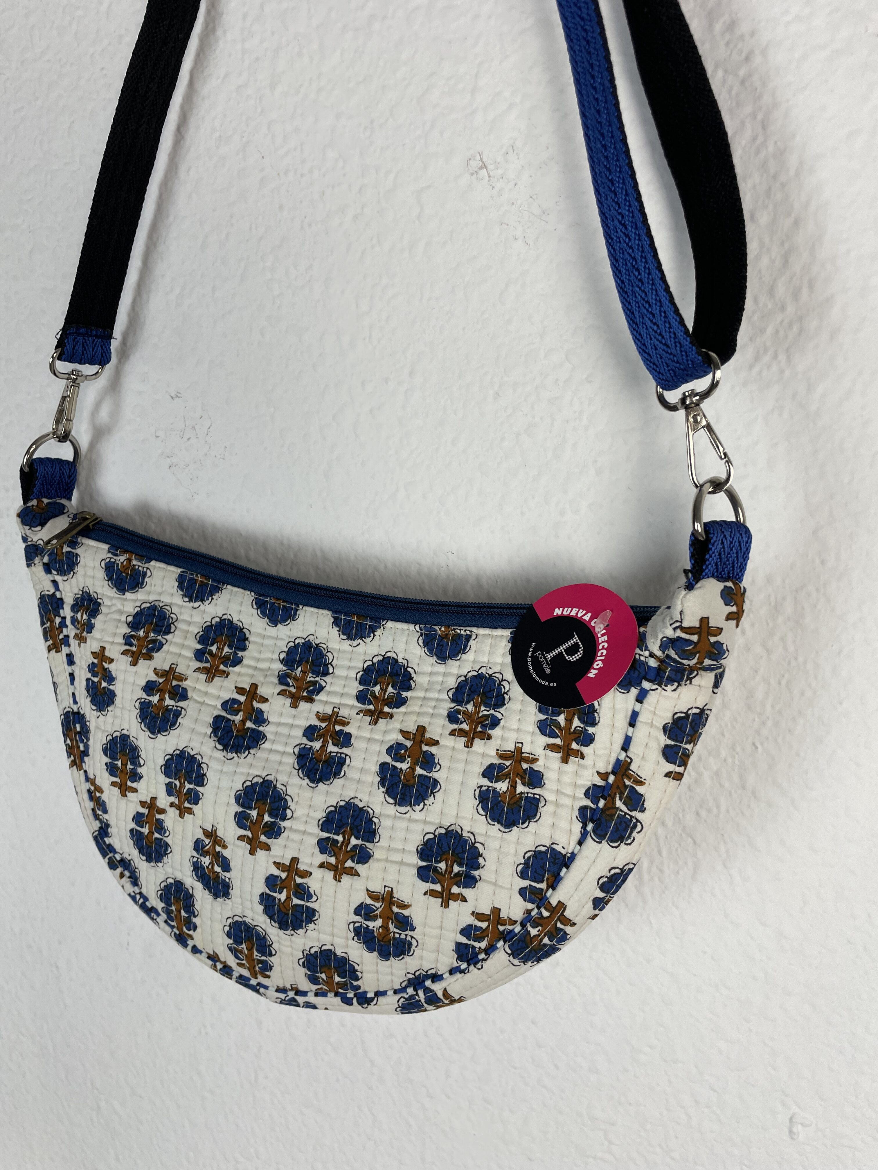 BOLSO ESTAMPADO AZUL Y MARRÓN MEDIA LUNA