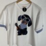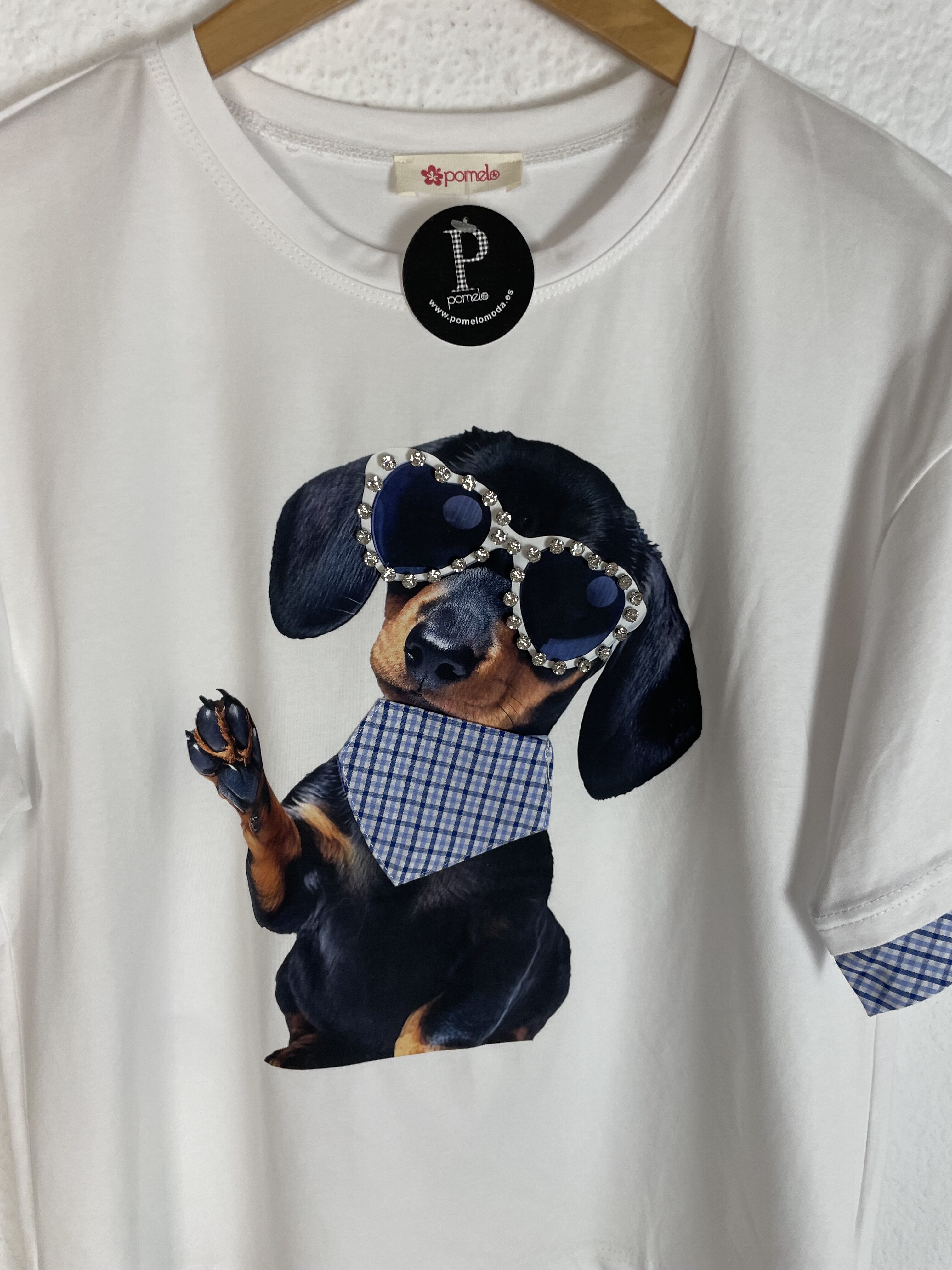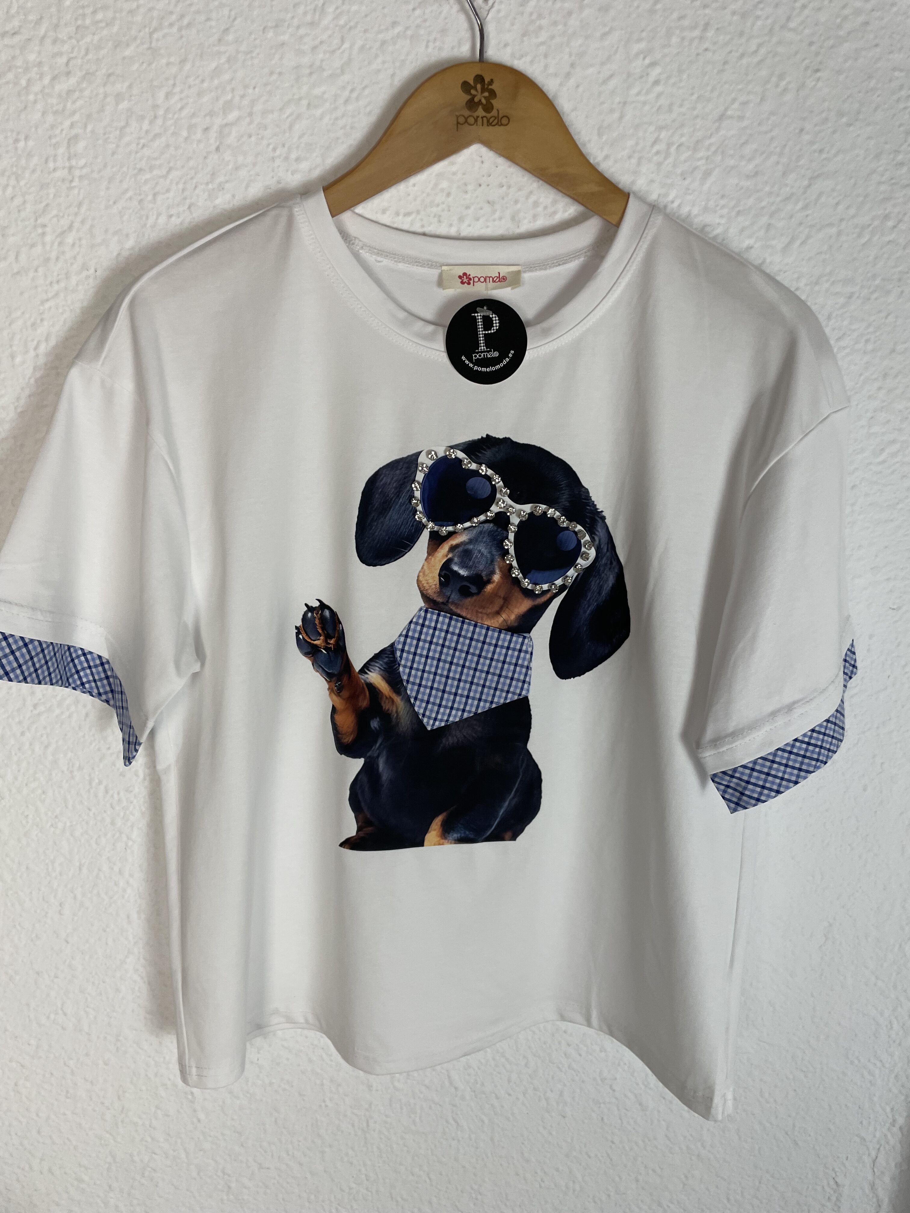 CAMISETA PERRO BLANCA DETALLES CUADROS
