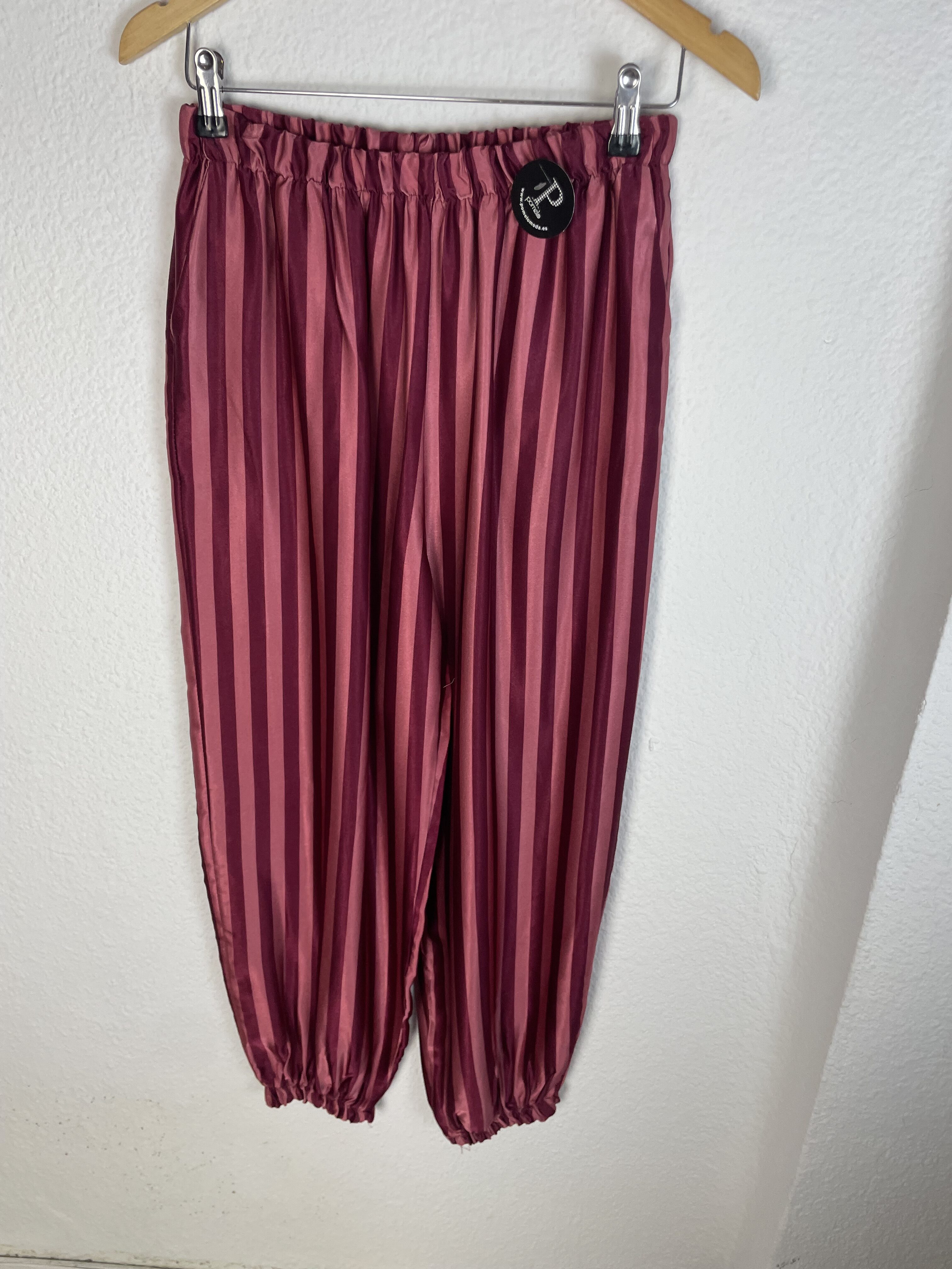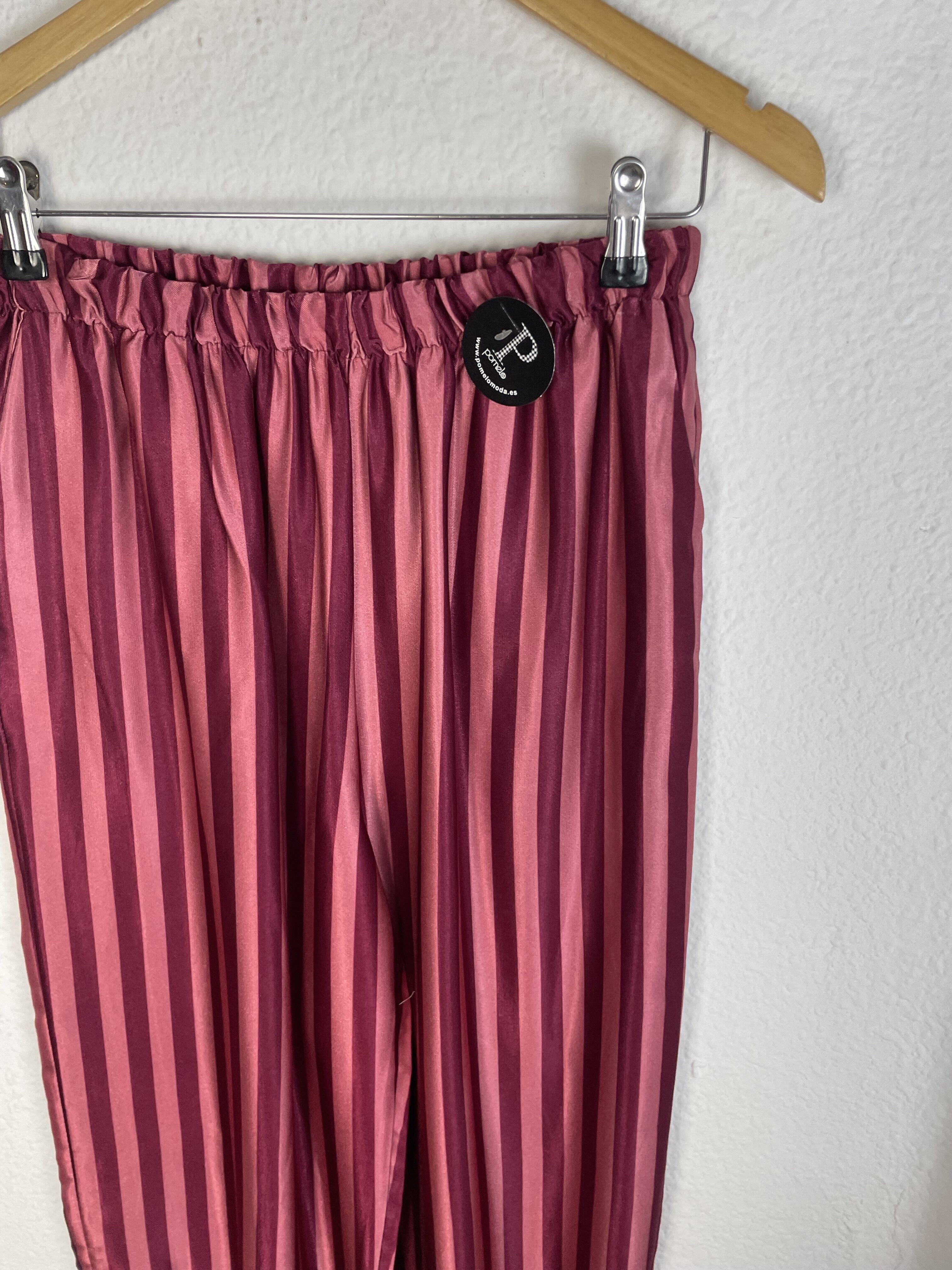 PANTALÓN SATINADO RECOGIDO ROSA Y ROJO RAYAS